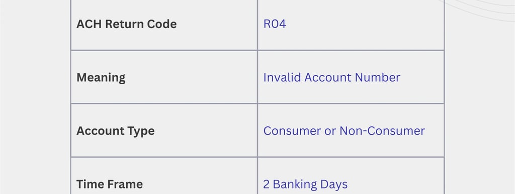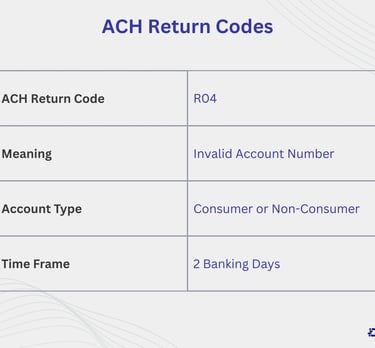 ACH Return Code R04 means “Invalid Account Number.”